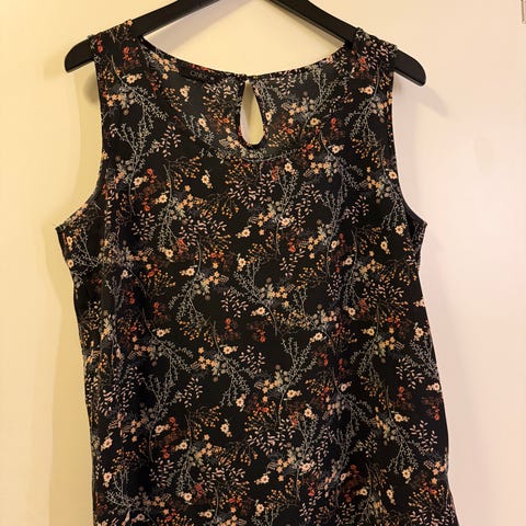 Blomstermønstret bluse med split i sidene. Lukkes med knapp i nakken.