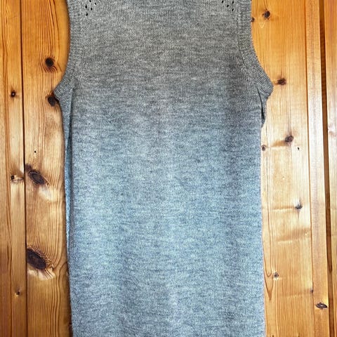 Kjolen er uten ermer, og har høy ribbestrikket hals. Deilig vinterkjole som er pent brukt.