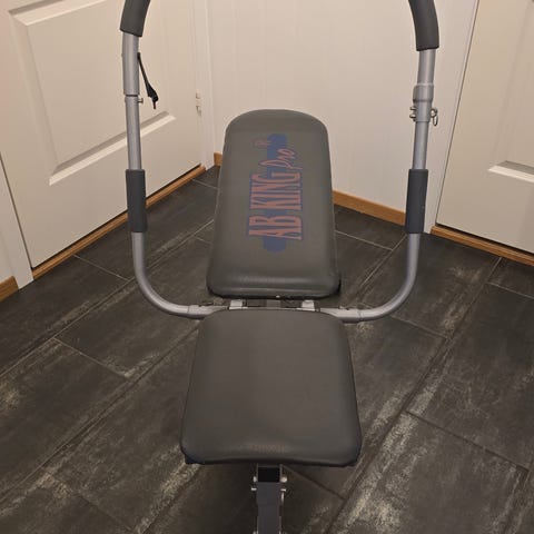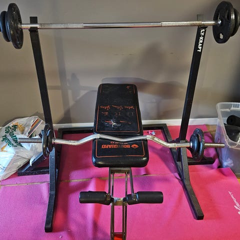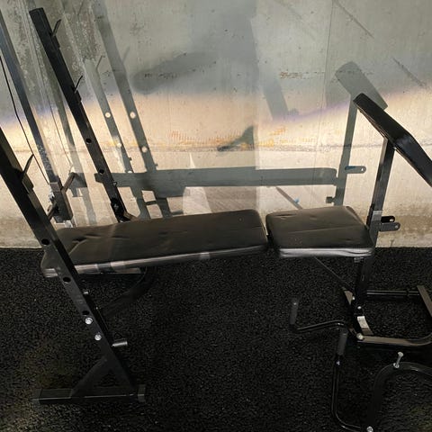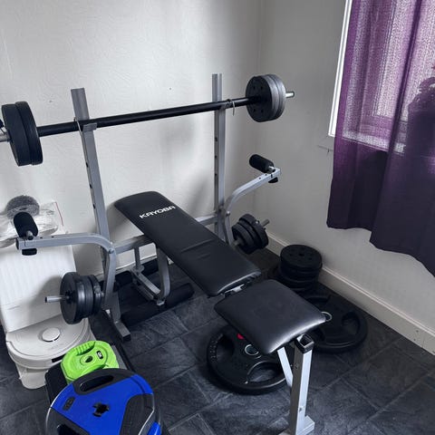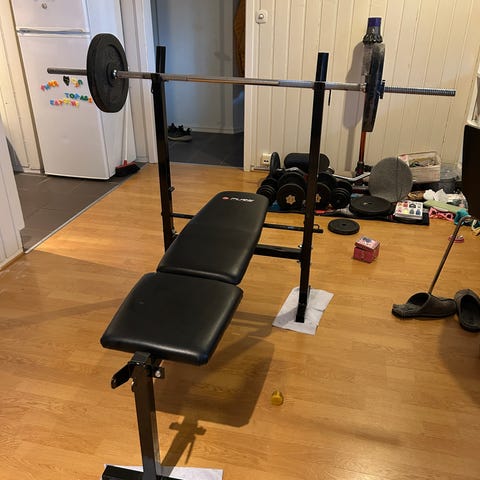 Selger en benkpress med manualer og noen vekter første mann får kjøpt det