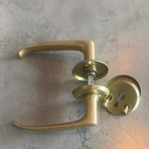 Reguitti dørhåndtak / dørvrider i furu og messing. Uåpnet pakke. Kan sendes.