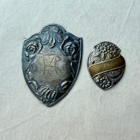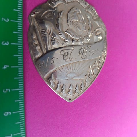 Dekorativt frakkeskjold i 830 sølv.