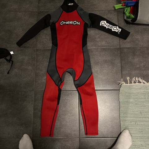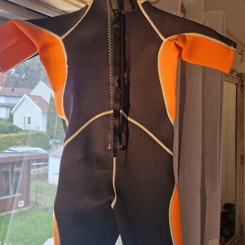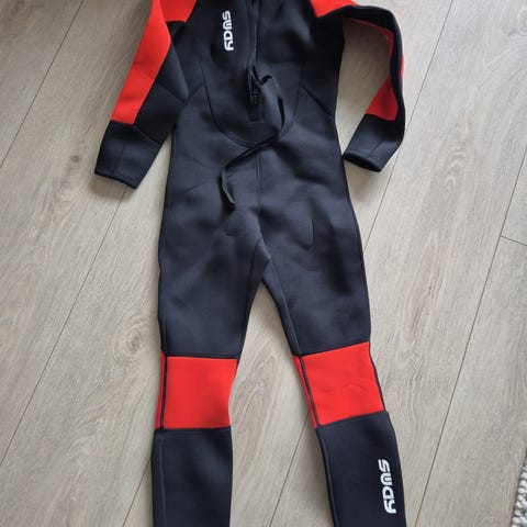 Våtdrakt i svart og rød farge. Str 12 år Laget for bruk i vannaktiviteter, gir isolasjon og beskyttelse mot kulde.brukt 1 gang