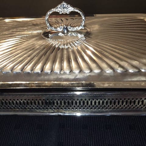 Serveringsfat i glass med stativ og lokk i sølvfarge. Kan sendes, eller hentes i Oslo sentrum. Pris kr 300, eller gi bud !