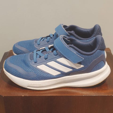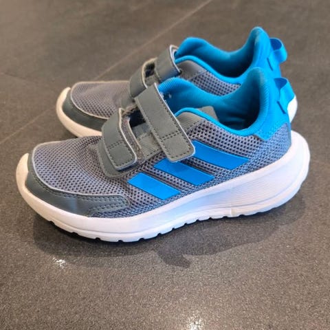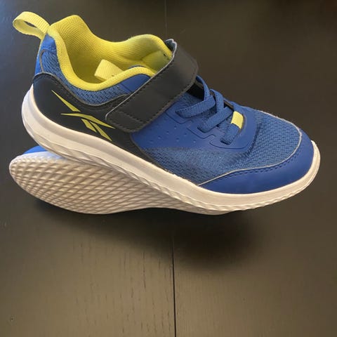 Reebok barnesko i størrelse 31. Skoene har en kombinasjon av blått og gult fargevalg, med hvit yttersåle. Designet med borrelås og elastiske lisser for enkel påkledning.