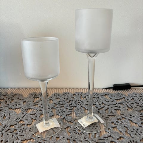 2 høye, hvite telysestaker/lysglass selges kr 200,-