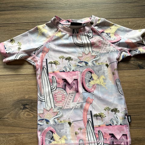 Molo badedrakt i størrelse 110/116 for jente. Badedrakten har svart farge med blomster- og stripemønster.