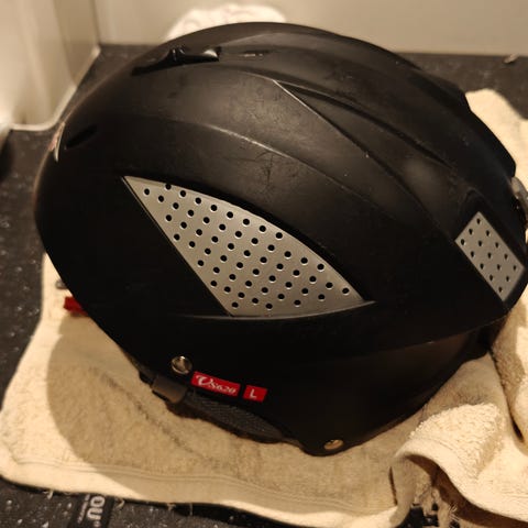God "rask" skihjelm fra Gabel med rød flammelakkering samt sort og metallic sølv. Justerbar lufting og go-pro feste. Mulighet for å sette på hake og panne beskyttelse, men de finner jeg ikke. Kul hjelm som er noen år. Ingen krasj eller dropp, men har noen små avskallinger på lakken.