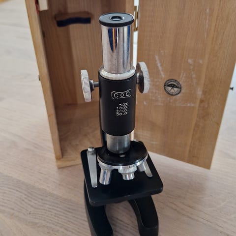 Flott gammelt mikroskop i original trekasse med div. utstyr selges.