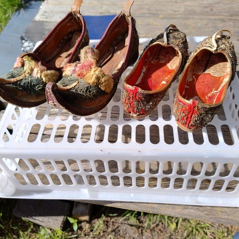 Selger fra samlingen. Sandaler ( men trolig mest til å sitte stille med) i tre innlagt perlemor.