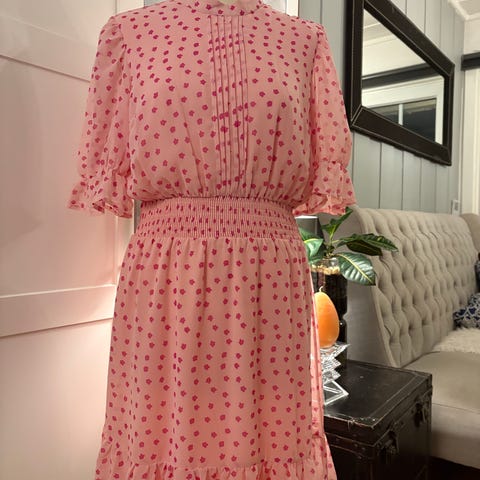 Nydelig pudder rosa kjole str S/MI halsen, se bilde, mangler litt perler, men det er lite synlig. Kr. 200,- sender gjerne mot porto.