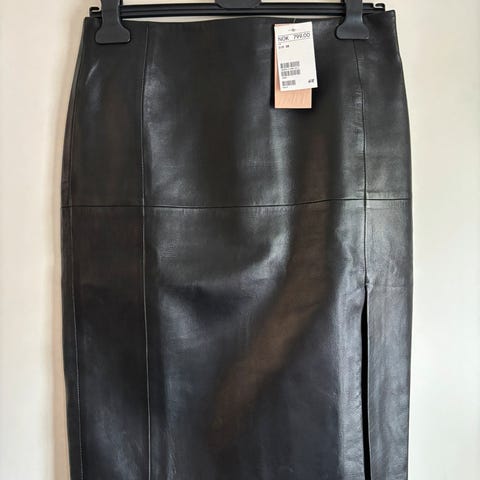 Nydelig sort skinnskjørt, kun brukt et par ganger. Skjørtet er kjøpt hos Timalu for noen år siden (har ikke kvittering). Skjørtet er i 100 % skinn, av meget myk kvalitet. Skjørtet er 42 som bredde i livet og 47 cm lengde, normal størrelse 38.