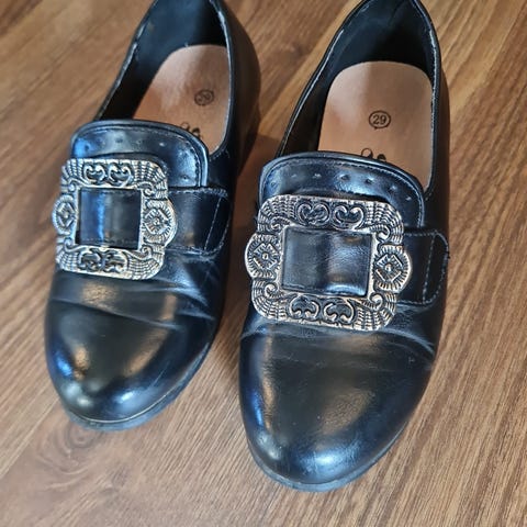 Selger Solveig bunadssko i størrelse 28. Tuppen på den ene skoen er synlig slitt