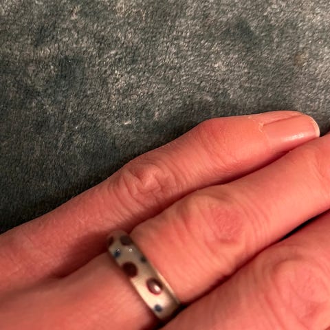 Pen ring med 6 orange stener og et hjerte på hver side. 2 cm i diameter, solid og laget i stål. Fin gave! Kr 175