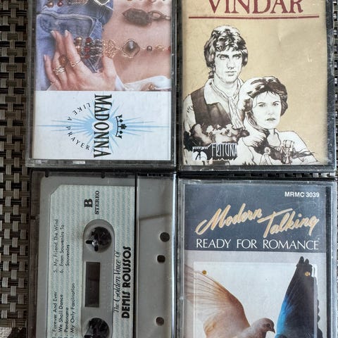 Samling av kassettalbum med artister og titler: Carola - Steg for Steg, Carola - På Egna Ben, Sissel Kyrkjebø - Glade Jul, Kassettalbumene er i standard format og inneholder musikk fra forskjellige sjangere.