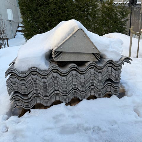 Selges 3 stk. cembrit plater. Var kort tid montert. Noen hjørner er skadet og med skrue hjulene rundt plate. Bredde 119cm lengde 275cm