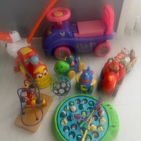 Disney barnleker assortert sett med ulike kjøretøy og figurer i plast. Settet inkluderer biler, fly, båter, bondegårdsdyr og små figurer i forskjellige farger. Egnet for barn som liker lek med kjøretøy og dyrefigurer.