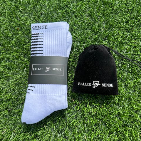 Baller Sense gripsocks i hvit farge med gummipunkter på undersiden for bedre grep. Sokker er designet for bruk under fotballspill og gir støtte og komfort. Passer også for løping og turn. Hoved bruken er for å minimere friksjon i skoene og gi deg et bedre grep.