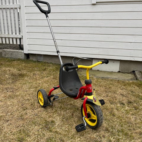 Trehjulssykkel i rÞdt, blÄtt og gult med pedaler og nummer 1 pÄ fronten.