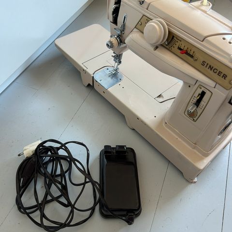 Solid rettsøm-maskin i metall med Sew-Tric 80W motor. Maskinen er elektrisk drevet med en effekt på 220 V. Komplett og pen for alderen. Ikke fulltestet, selges som den er.