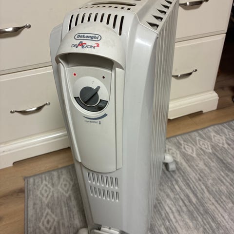 DeLonghi oljeovn radiator med justerbar termostat og to varmeinnstillinger. Designet for effektiv oppvarming av rom.