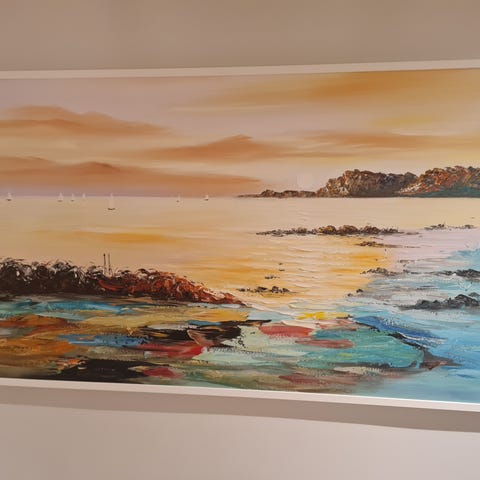 Luvine maleri som viser et havlandskap med fugler. Maleriet har naturlige farger og skildrer en kystlinje med vann og himmel. Passer til veggdekorasjon i hjem eller kontor.