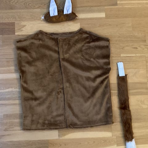 Brun pelsvest som kan knytes foran. Lengde: 42 cm, omkrets rundt livet: 90 cm.