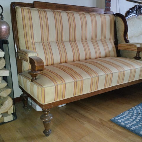 Biedermeier antikk sofa med treskjæring og beige polstring. Sofaen har en bølget rygg og buede armlener. Materialene inkluderer tre og stoff. Passer til bruk som sittemøbel i stue, oppholdsrom eller som kjøkkenbenk som vi har brukt den til.