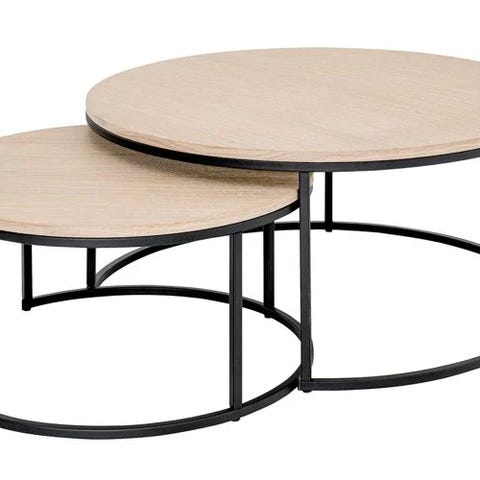 Porto et et tidløst sofabordsett i eikefinêr, med sort understell. Settet består av et stort bord på Ø:80cm og et mindre på Ø:60 cm.
