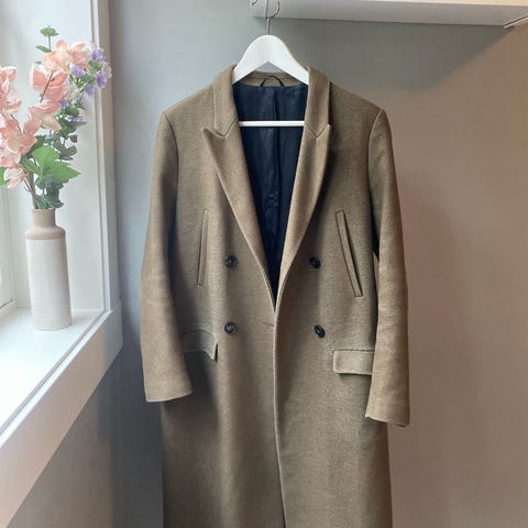 Den har dobbelknapp, en på innsiden og er veldig fin med eller uten skjerf til.