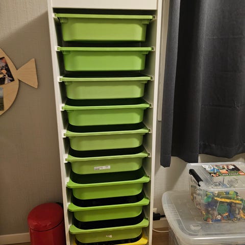 Jeg selger en pent brukt IKEA Trofast stamme med tre mellomstore bokser. Veldig praktisk til barnerommet. Ekstra bokser i flere størrelser samt hyller kan kjøpes på IKEA.