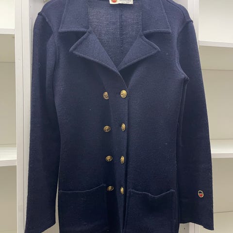 Jakken er detaljert med rutete jacquard, designet i en kort og litt videre fasong. Detaljert med fire gyldne ankerknapper og to lommer.