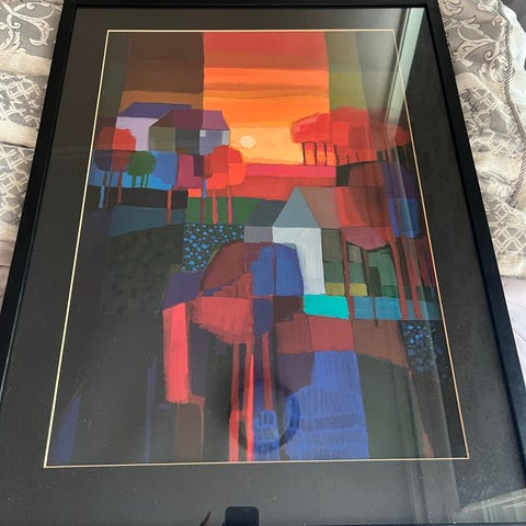 Maleri som viser en solnedgang over havet med farger i blått, gult og oransje. Maleriet har en firkantet form og er signert i nederste hjørne.