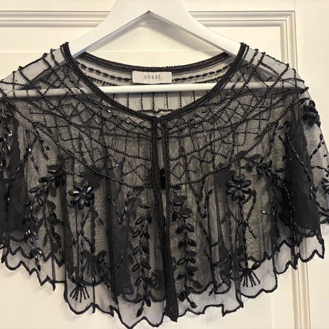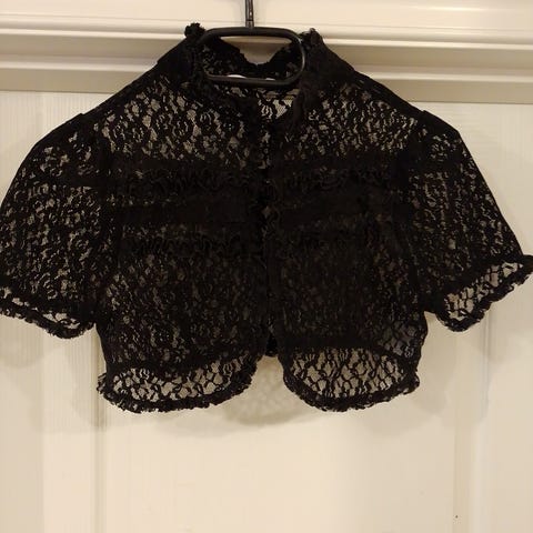 Nydelig poncho i sort chiffon med rosetter, lekker til både kjole, skjørt og bukser.