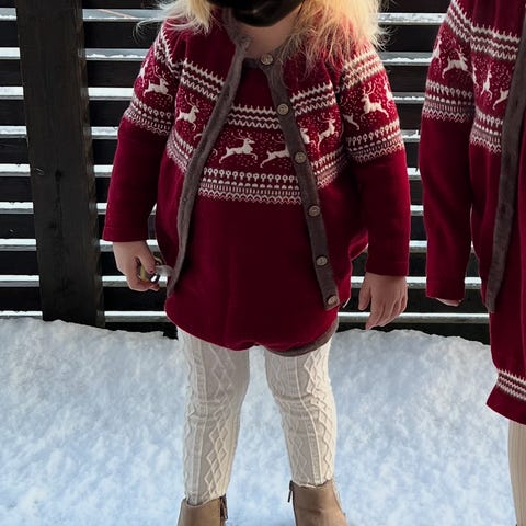 Nydelig juleromper fra Memini i 100% lammeull. Romslig i størrelse, og har også dobbel knepping slik at den kan passe lenge. Pent og sparsommelig brukt. Mener at den er vasket en gang.