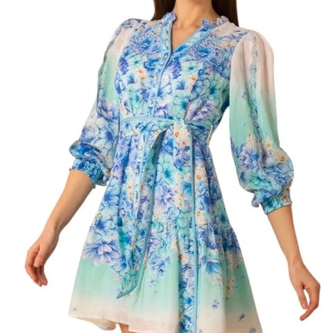 Pen foret chiffon kjole med trompet ermer i flere blåtoner. Ermene er ikke foret. Glidelås i ryggen. Normal i str. Kan hentes el jeg sender