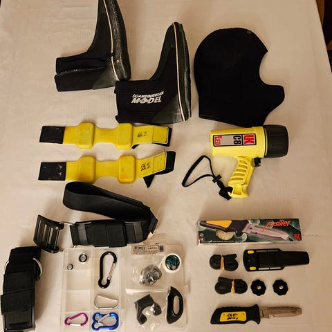 Selger en full fridykking pakke (https://www.jdykk.no/produkt/fridykkerpakke-hunter-yamamoto/) komme også med en harpun, kniv, dykkerline og ekstra vekt på belte. Ca 11/12 kg.