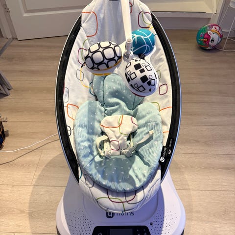 Selger en 4moms MamaRoo 4.0 som er pent brukt av ett barn. Denne elektriske vippestolen etterlikner foreldrenes naturlige bevegelsesmønster og er et perfekt hjelpemiddel når en trenger to hender fri. Stolen justeres gradvis fra horisontalt til sittende leie. Lekebøylen med de fargede ballene er plassert slik at babyen kan se den og utforske den.