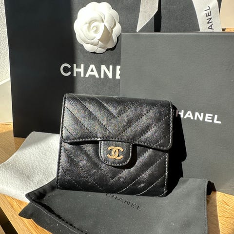 Lekker Chanel lær dame lommebok i svart farge. Lommeboken har flere kortlommer og en egen lomme med knapp for mynter eller småting. Materialet er lær, og designet er klassisk med quiltet mønster og Chanel-logo i metall.