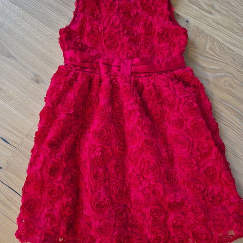 Søt rød julekjole str 110/116, litt stor i størrelsen kanskje. Kun brukt en dag.