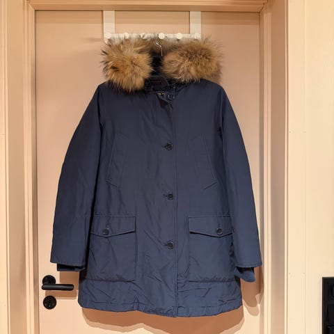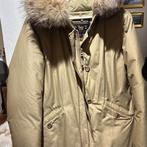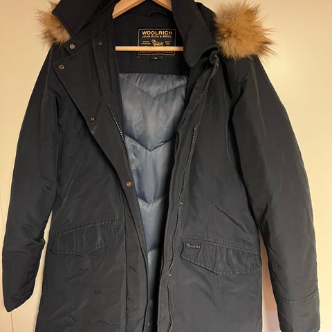 Pent brukt parkas fra Woolrich med avtagbar pelskrage. Mangler en knapp under den ene lommeklaffen, dette er ikke synlig. Liten i størrelsen, vil si den tilsvarer strl. medium, ev liten large.