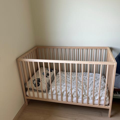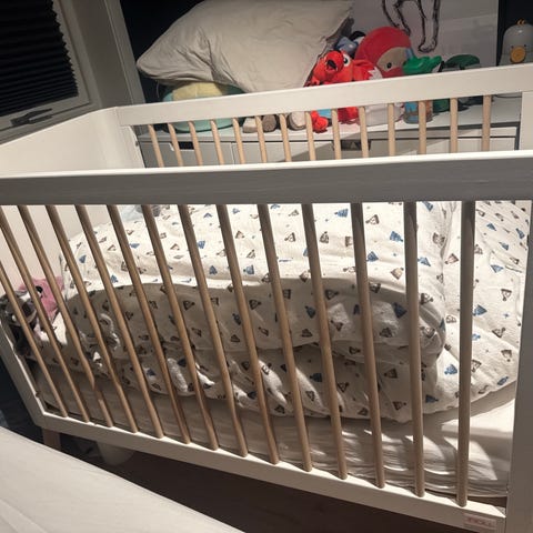 Noen små bruksmerker på seng- da der vi har kommet borti vegg ved flytting av den. Sengen kan heves og senkes til bunn. Kan også kjøpes til en del så den kan brukes som juniorseng.