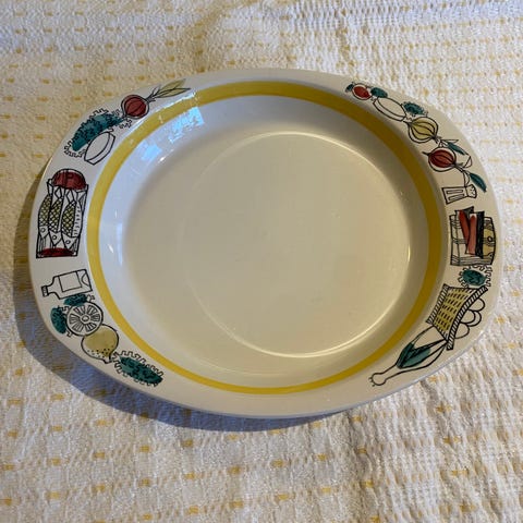 En ildfast serveringsskål fra Stavangerflint i serien Flamingo, og trolig med "brunette/gulnette" dekor. 1960-tall.