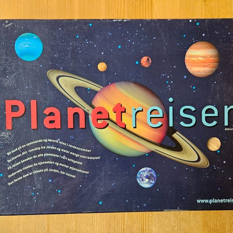 Planetreisen Brettspill med tema solsystemet, inneholder brett, spillebrikker, kort og terning. Spillmaterialer i farger som representerer planeter og romelementer.