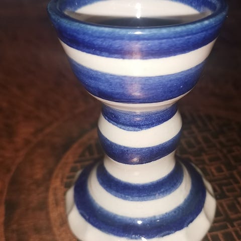 Lysestake i lakkert, eller emaljert metall. Pen, sjøgrønn farge.