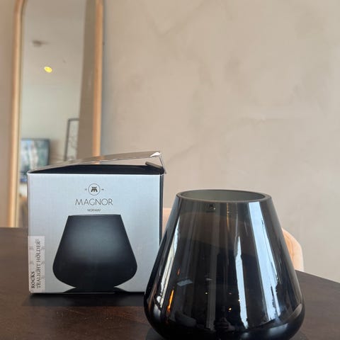 Magnor Glassverk glasslysestaker med bølget kant. Settet består av flere lysestaker i klart glass med dekorative bølgete kanter. Har 2 store på B 16 cm til 75 pr stk, 3 små på B 12 cm til 50 pr stk.