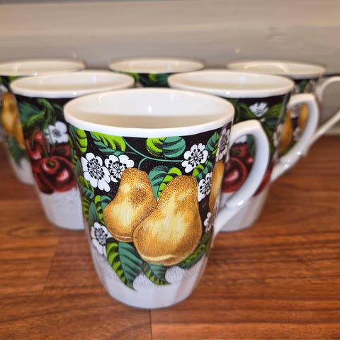 Vintage Dunoon kaffekopper fra 1980‑tallet, laget i stoneware i Skottland. Koppene har motiv inspirert av Tiffany Stained Glass, kjent for fargerike, glødende mønstre som minner om ekte Tiffany-glass. Glasuren gir en “glass-look” selv om koppene er keramikk.