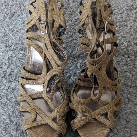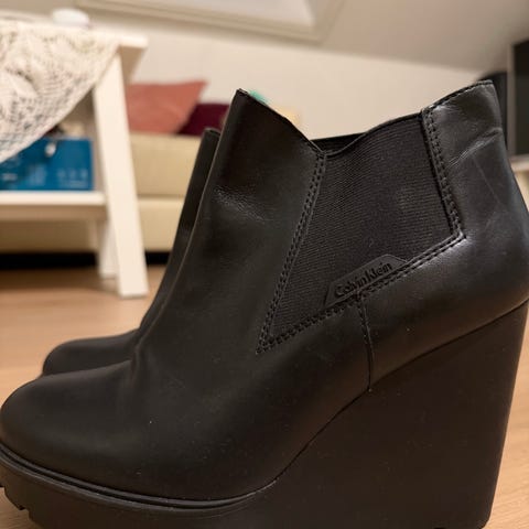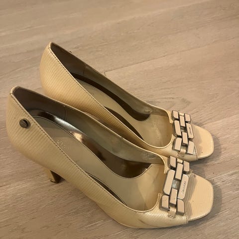 Calvin Klein sko med 9 cm høye hæler i størrelse 39./US 9. Skoene har en metallisk overflate med mønster i svart/grønn farge,,
