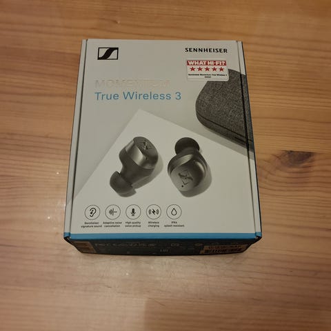 Sennheiser Momentum True Wireless 4 ørepropper. Esken den kom i og ekstra propper som vist på bildet følger med.