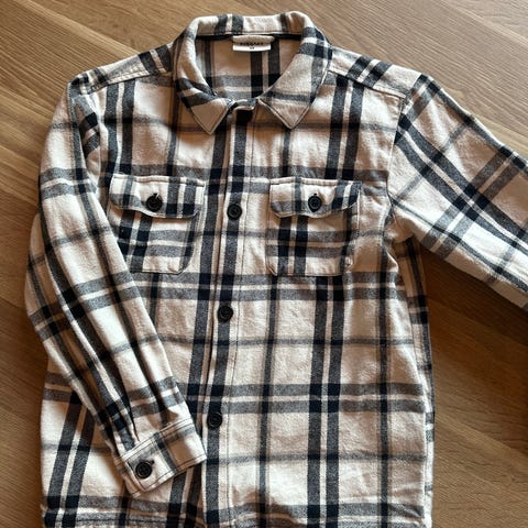 KappAhl skjorte i størrelse 128 for gutt. Flerfarget mønster i bomullsmateriale. Skjorten har knapper foran og langermet design. Rød skjorte med ruter og lys blå skjorte med mørke blå farge inni krage og armer. Nyvasket og klar til bruk.