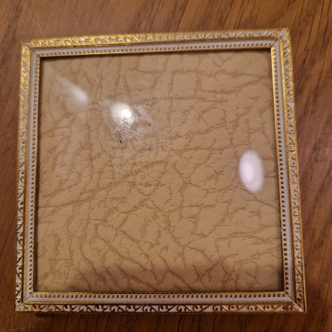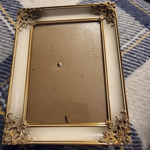 Rammen har en dekorativ kant og bakside med støtte for plassering på bord eller vegg.
